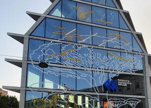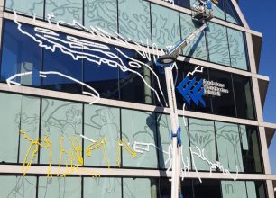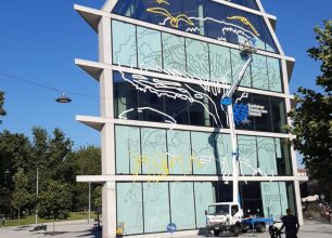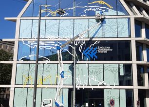 I nostri operatori, utilizzando la piattaforma area a cestello, si sono messi a disposizione dell’artista seguendo i suoi movimenti, in modo da permettergli di attaccare tutte le decalcomanie sui vetri della facciata.