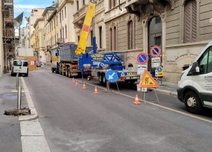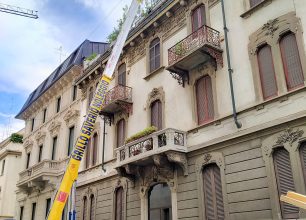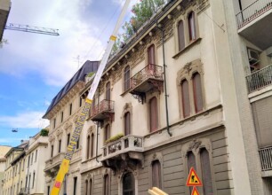 La piattaforma ha permesso di sollevare tutto il materiale e portare a terra le macerie, semplicemente con una richiesta di permessi di occupazione suolo pubblico e senza coprire la facciata di questo splendido edificio milanese.