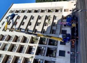 In questi giorni stiamo svolgendo un lavoro in assistenza ad una impresa edile con la nostra piattaforma da 50 metri, proprio su un edificio che ha questo tipo di rivestimento.