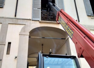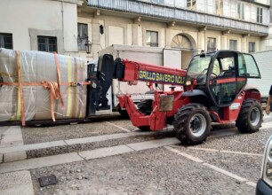 Utilizzando il sollevatore telescopico Manitou abbiamo recuperato i vari elementi di un’installazione, che sono stati imballati e caricati sul veicolo per il trasporto.