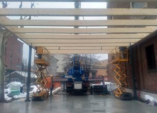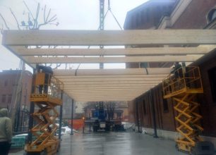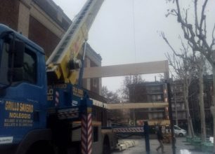 Insieme al nostro partner che ha preparato il progetto e le parti strutturali in acciaio e legno, abbiamo costruito la pensilina mettendo a disposizione i nostri operatori specializzati che hanno lavorato con l’ausilio di una gru per il sollevamento del legname e con due trabattelli elettrici (scissor) per l’assemblaggio dei componenti.