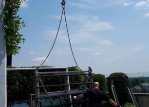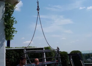 Grazie ad una delle nostre gru più importanti, siamo riusciti a sollevare su un terrazzo al decimo piano, tutti i componenti metallici di una veranda, in modo da rendere più semplice l’installazione e da migliorare la vita del nostro cliente.