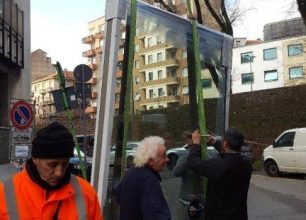 Non basta una piattaforma di sollevamento, ma bisogna disporre di speciali pinze per sollevamento lastre di vetro.