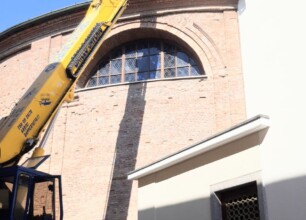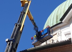 Utilizzando la piattaforma elevatrice da 50 metri e con l’ausilio di 2 operatori abbiamo seguito il nostro partner ed operato sulle gronde perimetrali della grande cupola.