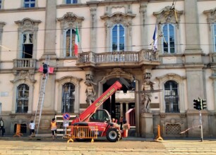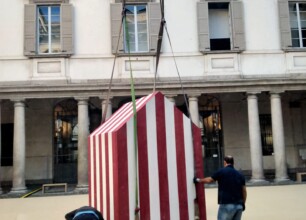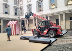 Proprio per un evento legato al Fuorisalone abbiamo trasportato e installato gli elementi di uno stand presso il cortile dello storico Palazzo Litta in corso Magenta. Per l’occasione è stato effettuata un’installazione dello studio Aires Mateus con il progetto Una spiaggia nel Barocco.